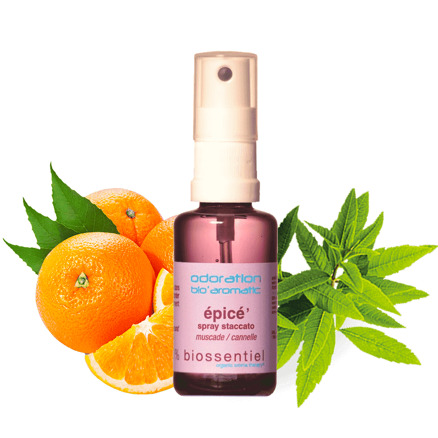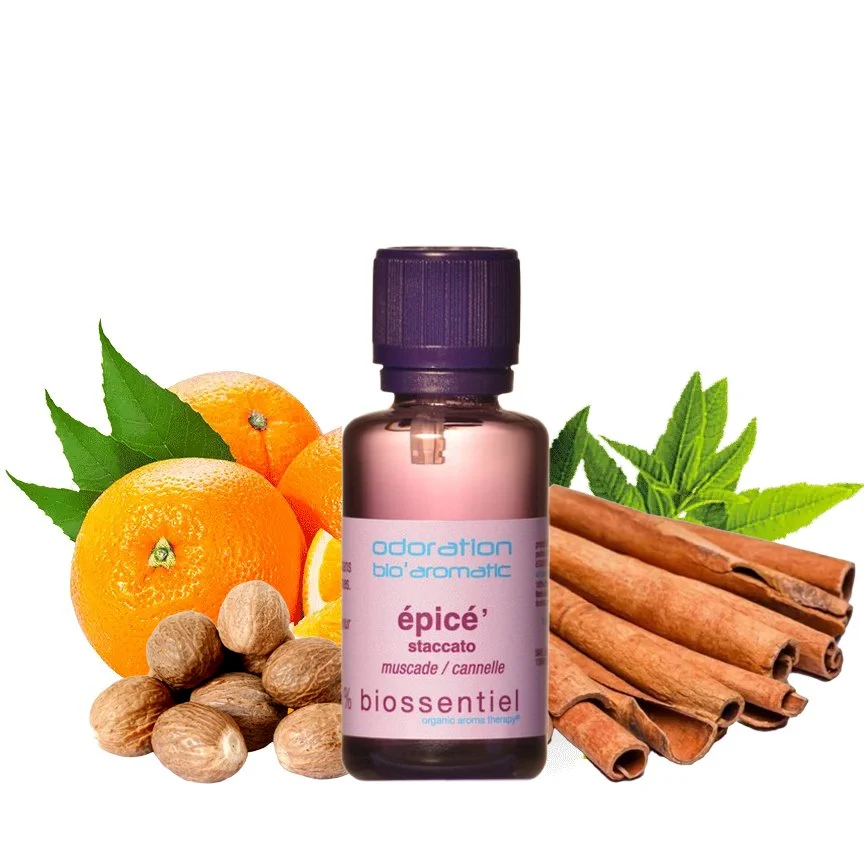 la diffusion épicé’staccato est un parfum d’ambiance sensuel aux huiles essentielles naturelles bio de muscade, d’orange douce, de verveine odorante, d’eucalyptus, de lemongrass, de girofle et de cannelle pour diffuseur aromatique. diffusion aux vertus vivifiantes et aphrodisiaques pour des sensations érotiques.